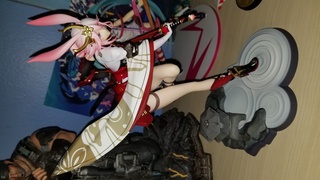 Little expensive but the figure itself is bigger than I expected. The gloss on armor and gold pieces look amazing and it is a shame I cannot look at it from all angles on my shelf to appreciate it entirely. The cloth has this design that makes it look almost flowing and appear to be real fabric despite being a different material. Definitely worth to buy but the key chain advertised is missing so gonna have to call about that.