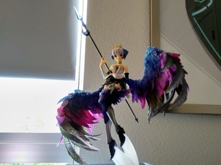 This figure is beautiful. The wings have so much detail in every feather, and they attach firmly to the body. They look fantastic with light bleeding through from behind. Her staff is durable metal that was easy to get into place with a translucent bladed tip. Even with the elevated pose, she is very stable on the base.