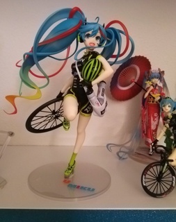 This is such a great pose of Miku in cycling gear, but there are a few problems. Mine has some stray white paint on the base that doesn't appear intentional and I don't see in other photos of this figure (on the left when facing Miku). The back side of her hair has some discoloration in one area that appears to be from color bleeding from another strand of hair, but fortunately it's not visible from the front. And, as another commenter noted, the hair is fragile and difficult to get all the way in completely. The base is still a bit visible if you look closely, but I think I have them in as far as possible, any more force risks breaking something. All that considered, it is st...Read more