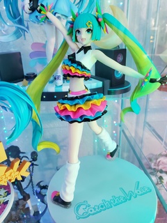 Delay after delay, and finally... she was worth the wait. The first thing that stands out is her big spiraling twin tails. Her paint is flawless. The leather jacket has a nice metallic coating, and her face is perfect. Her head, waist, and right hand are all removable, so assembling her is easy. She comes with two right hands, one of which has her guitar. The other can probably be used to pose her with other miscellaneous objects if you so choose.