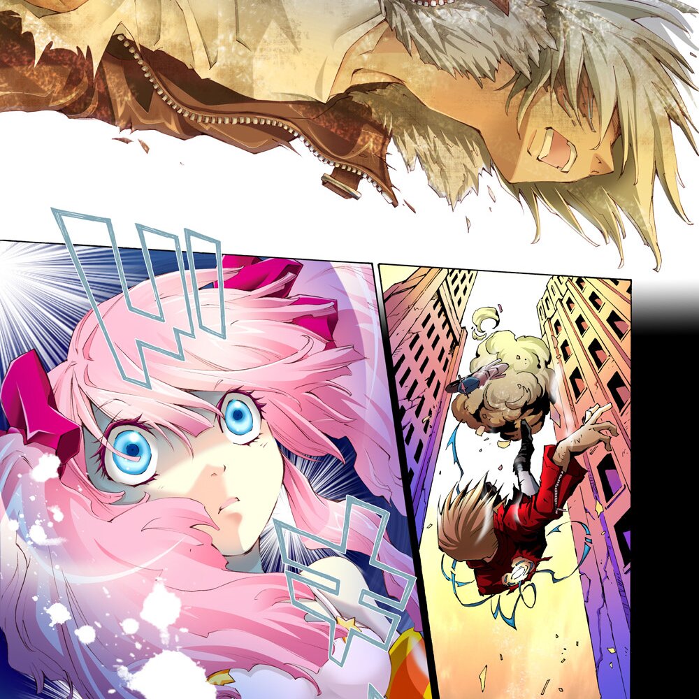 This is a scene in which REKI falls after being badly injured by Karumu. In the bottom left panel is a side character named Riko. This scene shows her telepathically sensing REKI’s urgent situation, and we really like the emotion and use of color, as well as the flow of energy within it.^^