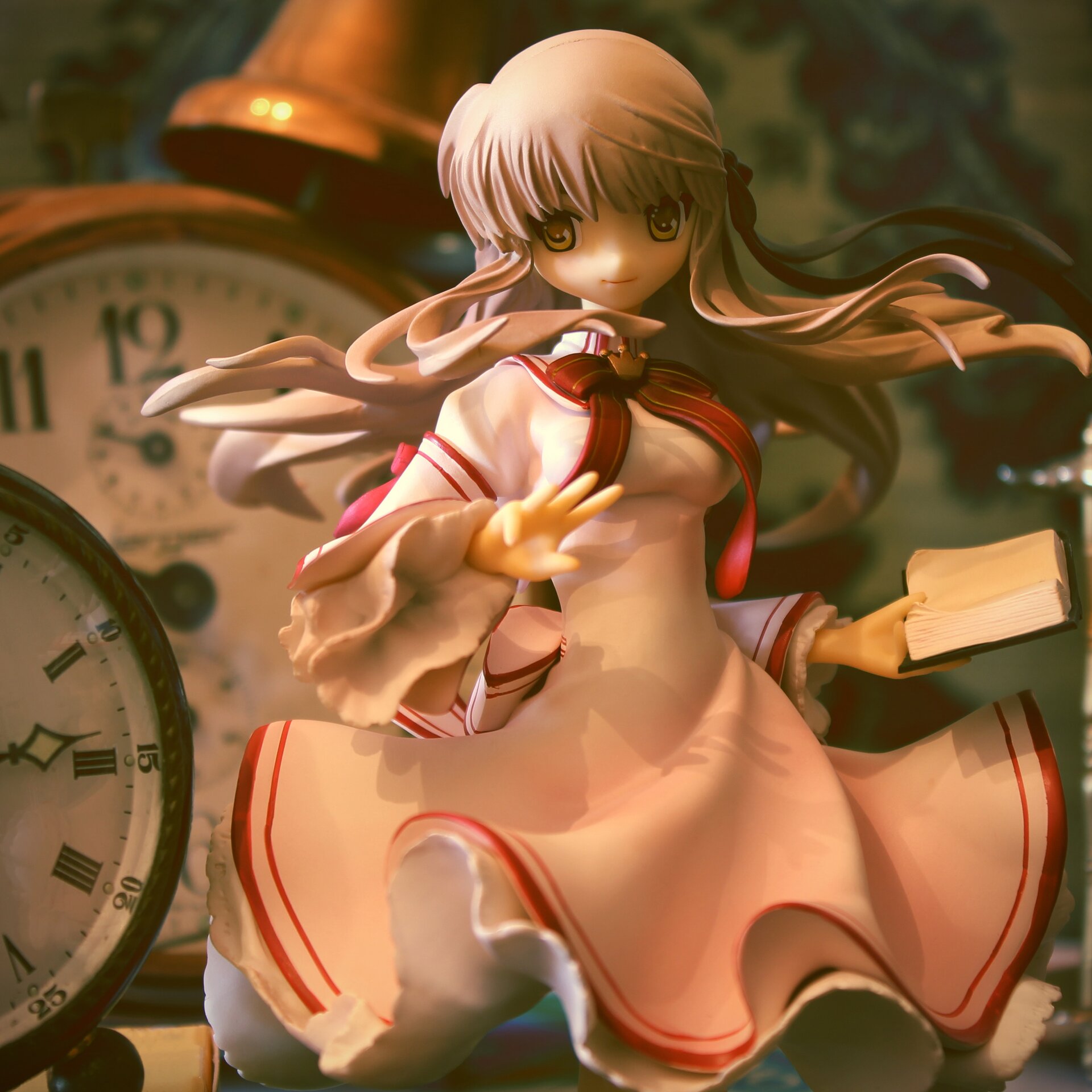 Time is stillThis photo was achieved by using a warm colour emphasizing the old-like atmosphere. The clocks are still, each with their own time, and the book which Akane is holding, tells a story repeatedly, going back in time whenever she wants to read it again.