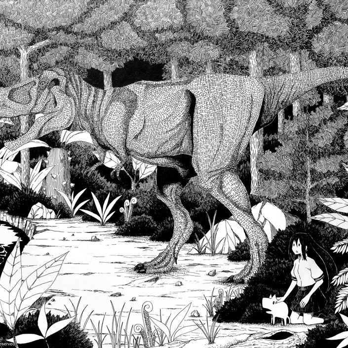 ScaryI couldn’t decide how to draw a rough look to the Tyrannosaurus’ skin, so inking it took a lot of time. Afterward, I couldn’t properly use the pen’s thickness, and looking back, I feel like I lost the feeling of perspective because of that. However, I am pleased with the dog’s fearful expression.