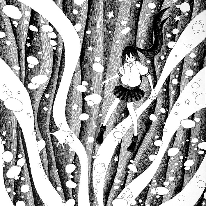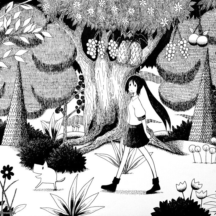 Home Town ForestI first drew this piece using a ballpoint pen. I wanted to draw a girl who wasn’t walking herself, but was rather being walked by a dog. Personally, I was worried about what I wanted to draw after this, and I certainly would have liked guidance as well. Without knowing how to best use the ballpoint pen, I drew this by trial and error. It’s called “Home Town” because it is the dog’s home town.