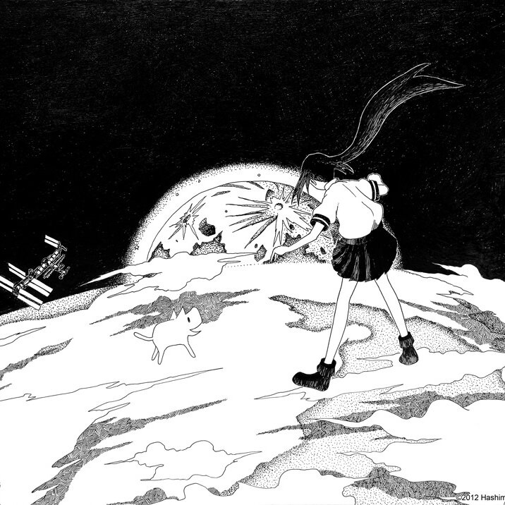 「 」The title of this piece is「 」and it depicts them jumping out into the empty space and viewing the moon from across the Earth. Dare I say, they most likely couldn’t talk at all. Thus, I thought having a blank title would be a fitting way to express space’s silence. I didn’t use a brush on the black portion of space; it was done only using a ballpoint pen. They might be difficult to see, but when I was layering the lines, I left faint gaps to represent stars.