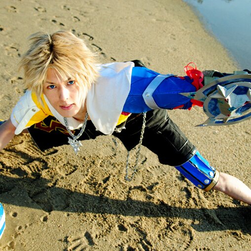 Tidus - FFXThis is cosplay of Tidus from FFX. FFX deals with the power of dreams and thoughts, existence, reunion, bonds, and salvation. For props, I made a blitzball and shield. I also made the Fraternity sword and a sphere, but they are not shown in this photo.