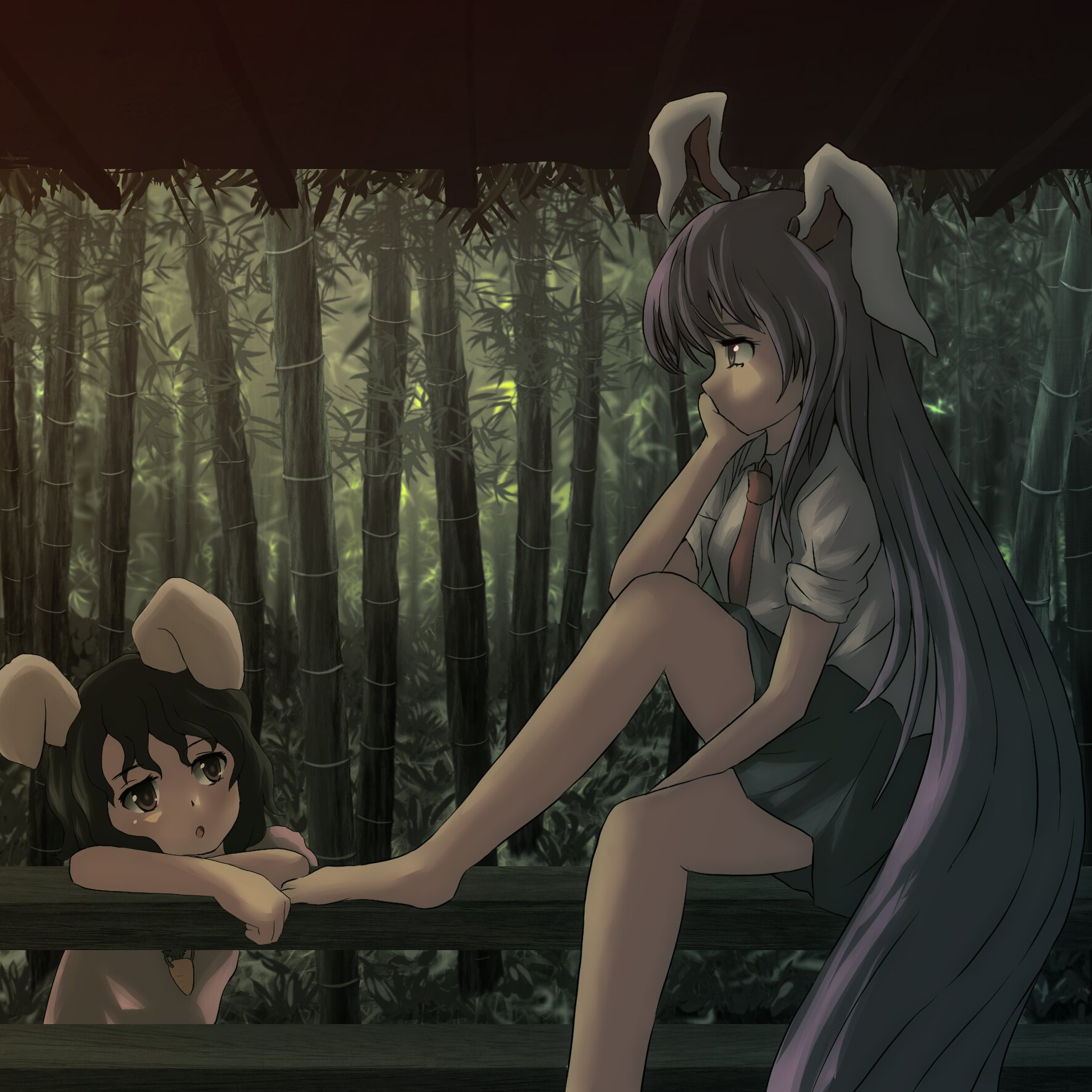 Garden of RecollectionThis work is of Reisen Udongein Inaba (right) and Teru (left) from Touhou. The characters appear in an extensive bamboo thicket. The uniquely peaceful air has a tinge of nostalgia to it. I think this piece captures the feeling of the connectedness between the characters and the background.