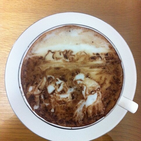 Mattsun's Latte Art: The Gleaners by Jean-François MilletRecently, aside from just drawing anime characters, I have also been drawing portraits and animals. However, what has been the most popular lately is expressing the world of some of history's greatest paintings as latte art. Using such a grand topic took too much time to fully investigate, and I was disheartened when my initial work amounted to nothing. However, the feeling of success when one finally came out to my liking was even more thrilling and exciting than when I draw other characters. It is said that my latte art is similar to India ink painting in that my art is drawn from two separate shades of white and brown. In the future, I plan to challenge myself to draw more in the style of India ink painting and to also use different bowls to draw in, not just cups. I want to challenge the limits of what is possible with latte art.