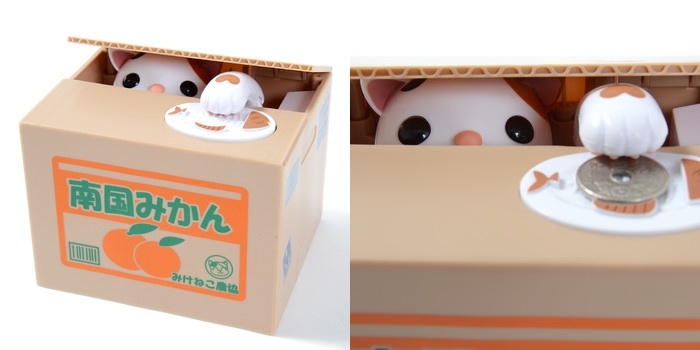 | The Itazura Bank is every cat ever, personified by a coin bank device. Cat’s love nothing more than to sit inside any box they fit into, lying in wait sneakily and swatting at anything that comes even remotely close. This Calico Cat will stea-...uh, put your coins safely away for you when you place it on the plate in front of him! What better way to encourage yourself to save some change than having the chance to see this adorable kitty come out of his box and tuck it away with his little paw? |