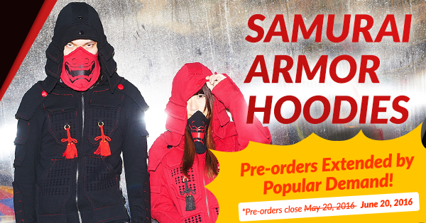 By popular demand, we’re extending the pre-order deadline for a limited quantity of only the most popular versions of Samurai Armor Hoodies!