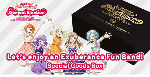 | [TOM Exclusive] Celebrate the winners of the English version of the "BanG Dream! Girls Band Party! 2nd General Election" with this Let’s Enjoy an Exuberance Fun Band! Special Goods Box packed with collectables featuring Arisa Ichigaya, Hina Hikawa, Ako Udagawa, Kokoro Tsurumaki, and Hagumi Kitazawa! |