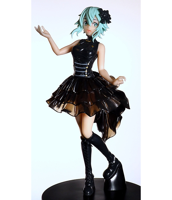 | I wasn't sure if I would like this figure, since it didn't look like it would be good quality, but I was relatively surprised with it. The translucent dress really makes this figure shine, as it complements the glossy texture of the dress well. Most of the figure looks to be colored plastic, which is a good thing since the only painted parts are not painted that well. The gold accents and silver bands on the upper part of her dress are painted a little sloppy, but the sloppiness probably varies between figures. Mine wasn't too bad, it's what you would expect at this price range. Overall, love this figure and would recommend to any SAO or Sinon fan. |