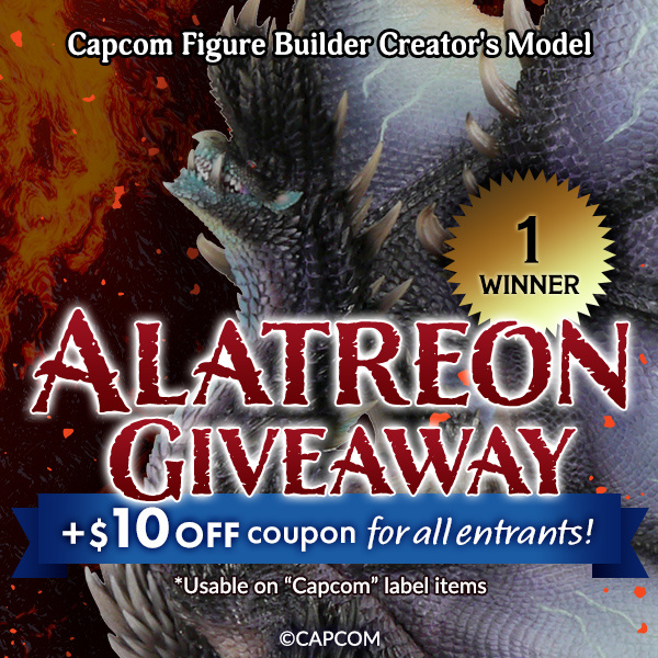 | [New Figure + Coupon Giveaway] This magnificent Alatreon figure was produced to commemorate the 20th anniversary of the Monster Hunter series. Enter now for a chance to win one of your very own! All giveaway participants will also get a coupon good for $10 OFF Capcom items ranging from figures to plushies to stickers. (The coupon codes will be send out after giveaway entries close.) |