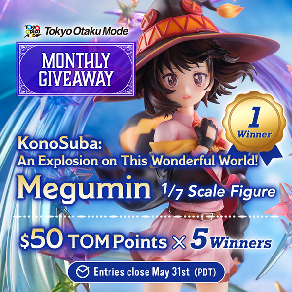 | Here’s your chance to win a gloriously colorful, top-quality Megumin figure produced by eStream. Five other winners will instead receive $50 TOM Points each—not bad for a consolation prize! |