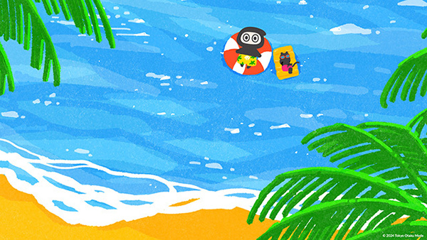 | Ninja-kun is ready for summer in a new beach-themed Premium exclusive wallpaper! Visit our wallpaper gallery to add this cute free art to your computer or smartphone. (You can also download any past designs that catch your fancy.) |