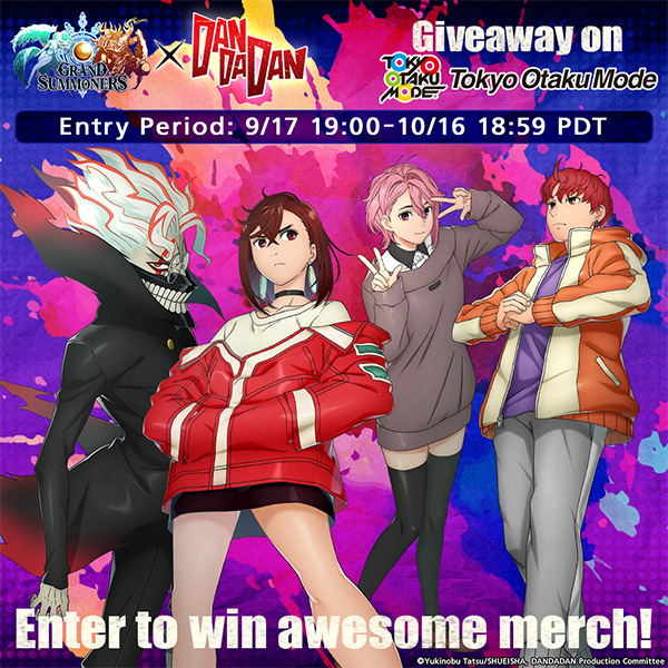 | Celebrate the cast of DanDaDan joining the hit-anime RPG GrandSummoners with an amazing giveaway hosted by TOM! Up to 43 fans will win DAN DA DAN-related merch, so don't miss your chance to win. |