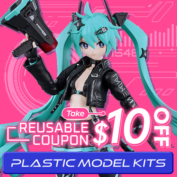 | Grab this reusable coupon code to get $10 OFF every time you order plastic model kits! We’ve got something for everyone, whether you prefer humanoid characters or robots (or a dramatic fusion of both). |