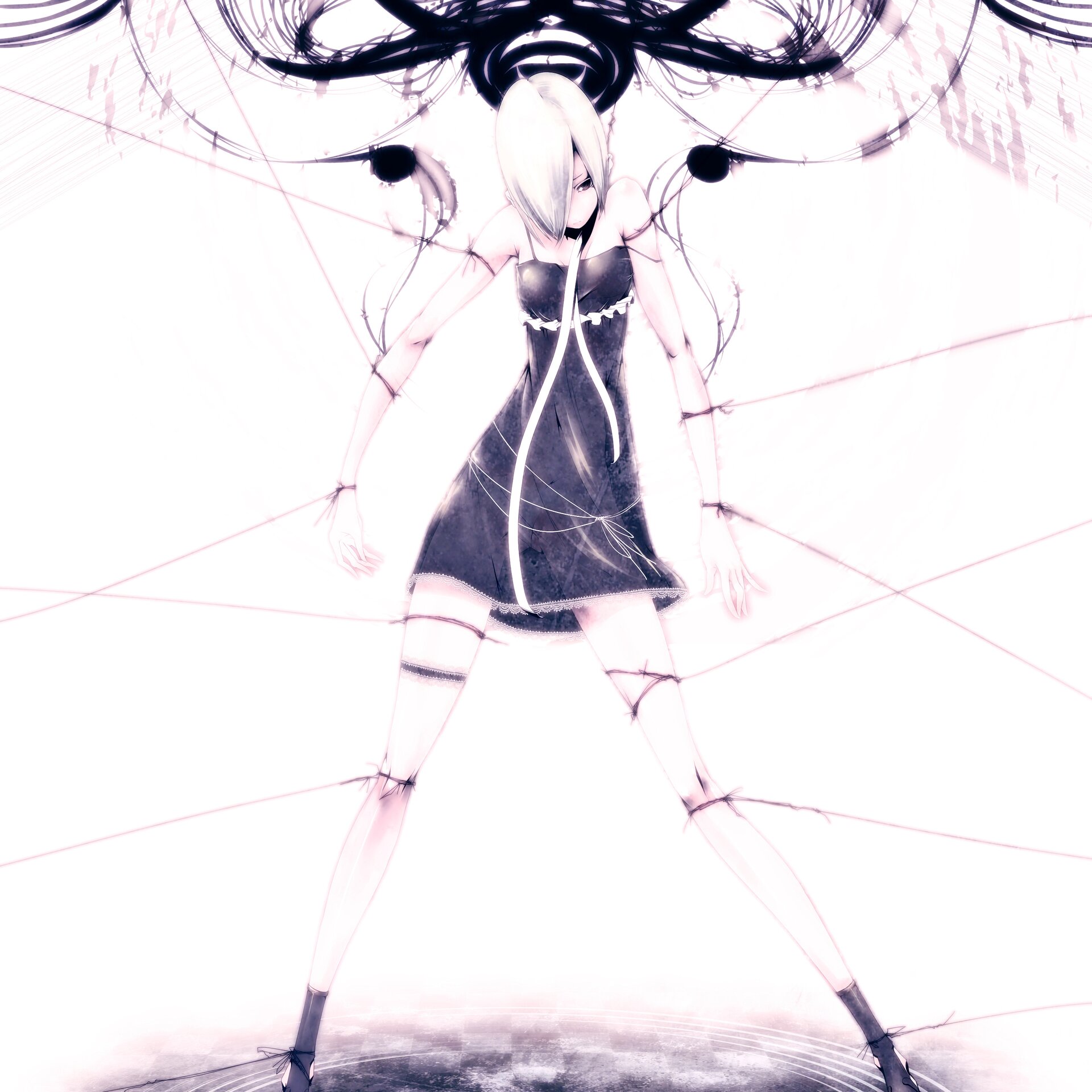 bind2This picture was published in the original character contest of the OTACOOL magazine, a reader-participation publication which distributes otaku culture to the world, published by Kotobukiya, a company known for it's figures. I drew this with the theme of stylish and sharp binding. People usually associate the word "restraint" with ropes and chains, but I had the feeling that it would have an adult impression had I drawn it like that. Using wire I tried to make it give a sharp impression first. I wanted the thought "if i think about it, it's pretty erotic" to be only the second impression. I deliberately drew the girl and lines thinner and her limbs longer, making a balance like she was softly slipping away.