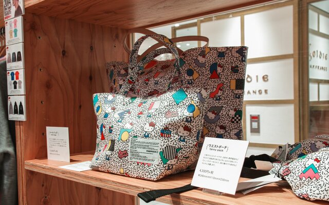 There are many Hello Kitty goods in the store related to her 40th anniversary. Picking up considerable attention in the store are the collaboration items between Fabrick, a textile brand produced by Medicom Toy, Stereo Tennis, a graphic artist who has created many popular idol goods, and Hello Kitty. A highlight of these items––which include a PVC document case, mini tote bag, and wallet––is the contrast between the catchy outer design and the cute pink coloring on the inside.