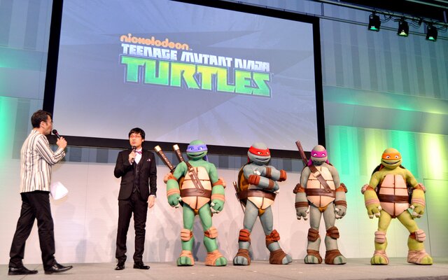 At the party held on March 30, figures of the Turtles and related goods were on display throughout the venue. Also shown at the party were the collaboration music video for “Shinobu,” a song written just for the anime by popular Japanese vocal group GReeeeN, the ending theme “Bookasha” by rock band Ulfuls, and, of course, the TV anime. Being screened for the first time in Japan, the crowd let out “oohs” and “aahs” with each passing scene of the anime. It was also announced that the new live-action movie will release in Japan this December and a special PV was shown.