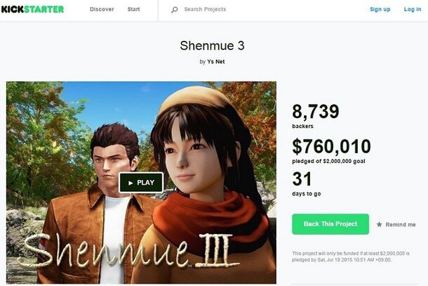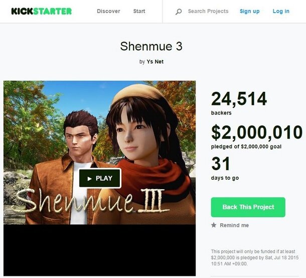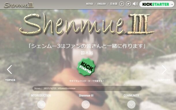 The crowdfunding campaign for Shenmue 3 that began on June 16 has reached its goal of $2 million (approximately ¥247 million). The goal was reached just 9 hours after the project was announced.