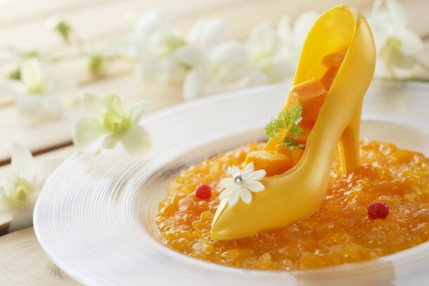 Surprise Second Overture - Every day, one lucky customer will be treated to a Miyazaki Mango Cinderella Chocolat! An almond dragee (a roasted almond coated in sugar) will be hidden inside just one of the Soleil Himawari avant desserts. The lucky customer who finds this almond dragee will receive the surprise gift of a Cinderella Chocolat - a beautiful dessert in the shape of Cinderella's glass slipper! The cute colour of this chocolate high heel is thanks to richly sweet Miyazaki mangoes. Maybe your fairy godmother will grant your wish and let you enjoy a special moment with this stunning dessert!