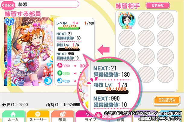 Before, you couldn’t practice with two unequal cards of the same member, but now you can using stickers. You can also increase the number of slots for school idol skill sets.