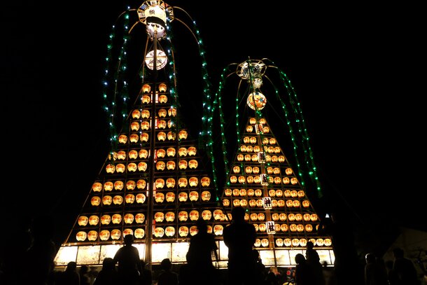 The sound of taiko drums and flutes rises up from the hayashi (traditional Japanese orchestra) as young people wearing happi coats parade through town while pulling Tatemon, triangular sail-shaped floats decorated with rows of lanterns. A Tatemon is a roughly 16-metre-tall pillar from which over 90 paper lanterns are strung in a triangular shape, with illuminated pictures below. Each one of these sail-shaped floats is 10 metres tall, weighs around 5 tonnes, is supported by a base, and is enthusiastically pulled around town by around 80 people.