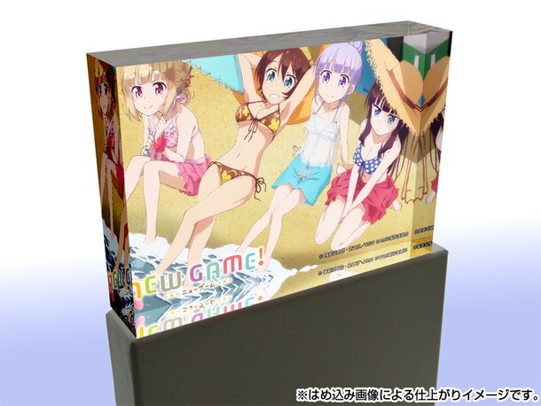 This clear art cube is decorated with an illustration of Eagle Jump employees Aoba Suzukaze, Hifumi Takimoto, Hajime Shinoda, and Yun Iijima from New Game!! They look dazzling in their swimsuits, and the acrylic material allows the beautiful colors to be carefully added to this transparent item that you’re sure to enjoy!