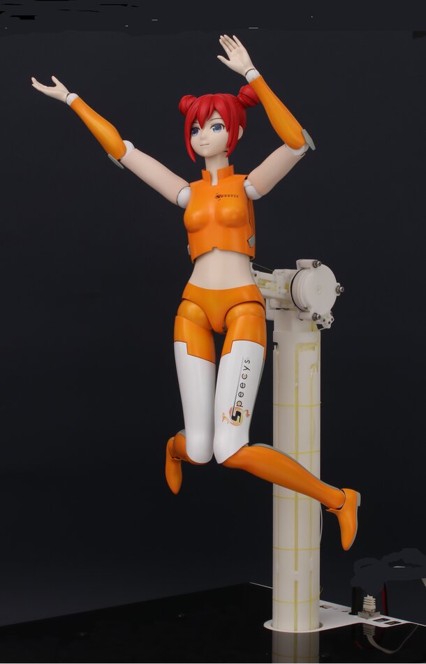 In 2014, Speecys used the patented Motion Figure System in a slim character figure aiming to make it move smoothly and quietly resulting in the Motion Figure MF201. The joints of the doll-style figure were driven by various wires, the driving force being provided by the servo motor controlled via the CPU installed in the lower mechanism’s unit. The slim outside and quiet movement came together to create the impression of a real moving figure.