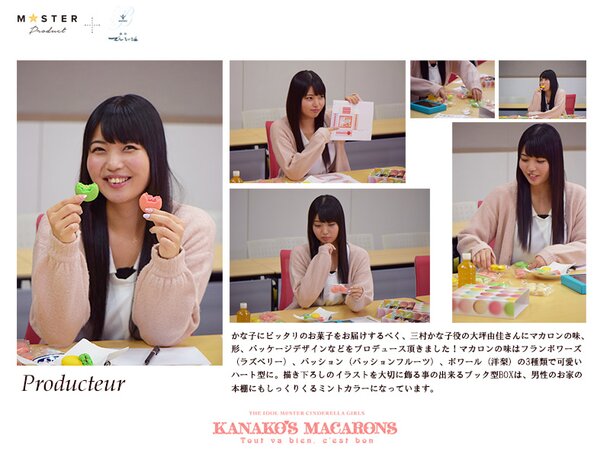 Kanako Mimura from The Idolm@ster Cinderella Girls loves making and eating sweets. So she must have been delighted to become a campaign girl for Boul'Mich, Japan's national French confectionery brand! Boul'Mich is famous for its variety of baked sweets, and Kanako has teamed up with the company to make delicious macarons just like the ones she made in episode 6 of the anime series. Kanako's carefully arranged them in a special box and she's ready to deliver them to her producer.