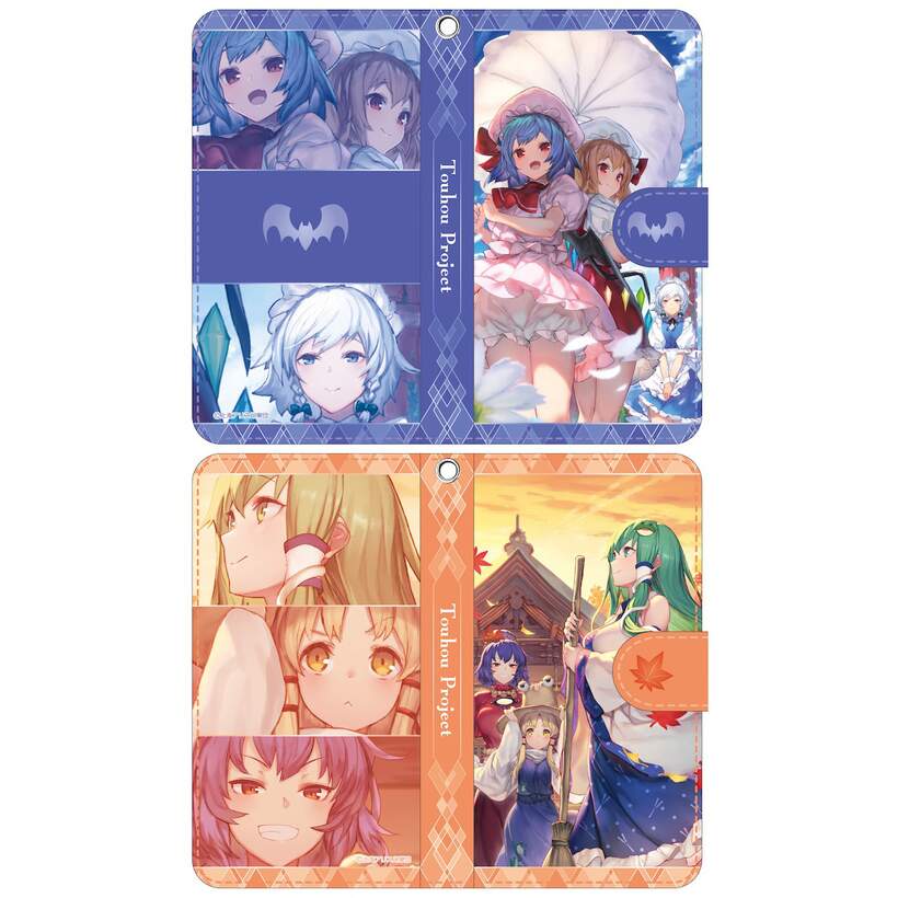 From Movic comes these high quality flip-style smartphone cases featuring art of fan-favorite Touhou Project. Choose from one featuring Remilia, Flandre, and Sakuya or one featuring Sanae, Suwako, and Kanako. Each is vividly colored on faux leather and features an adhesive pad for your smartphone to attach to as well as two card pockets and a hole for a strap. Also has a magnetic closure with bat or leaf detail depending on the version! Measures 5.9” x 3”.
