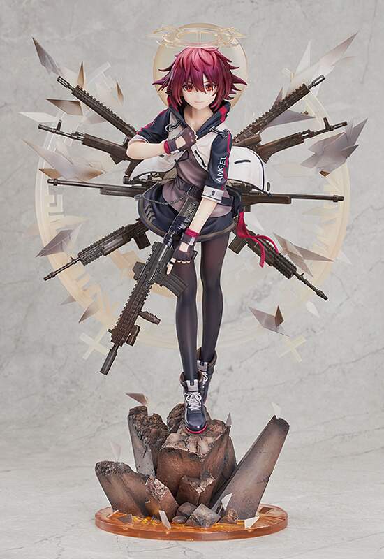 The artwork’s details have been faithfully captured in figure form, including the eight Laterano guns behind her and her halo and wings. The figure is packed with other details as well, from the look of her windswept outfit to the intricate sculpting and texture of each of the rifles. Let this angel of the battlefield descent into your collection!