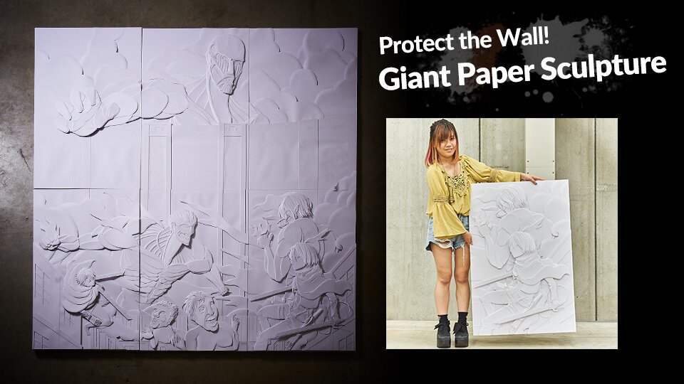 This massive (6.5’ x 6.5’) paper sculpture was made by paper sculptor Tatsuya Takahashi. It depicts in painstaking details Levi and Mikasa with their 3D Maneuver Gear as well as Eren in his Titan form all bravely protecting the wall from Titans including the Colossal Titan and Armored Titan. This incredible paper sculpture is surreal in photos and breathtaking in person. It’s made up of six panels and who knows how many cuts of paper!