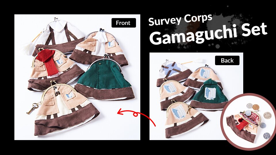Artisan Yuko creates beautiful gamaguchi, Japanese-style coin pouches, in both classic designs as well as designs inspired by fairy tales and anime. This set includes five gamaguchi inspired by the uniforms of Survey Corps members Mikasa, Levi, and Eren as well as one inspired by Levi’s infamous cleaning outfit which comes with a mini duster attached. One gamaguchi also has a small key attached to represent the basement key given to Eren. The sewing is impeccable as are all the details, from Mikasa’s red scarf to the hood on Armin’s green cape. The inside features elegant fabric with a sewn on Gamaguchi Yocane emblem.