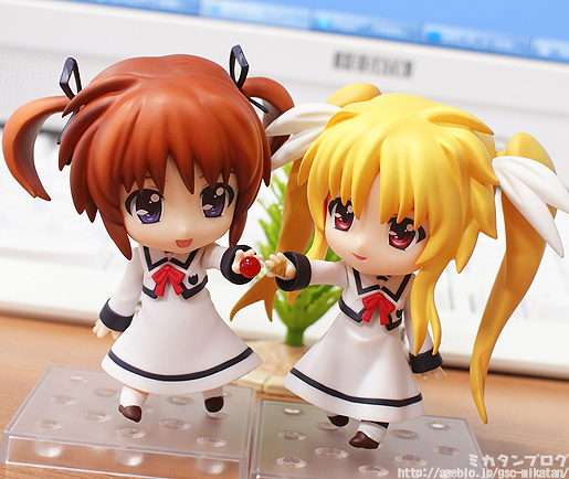 Nendoroids of Nanoha and Fate from the most recent Nanoha movie, both wearing their school uniforms! They also both come with a variety of optional parts!