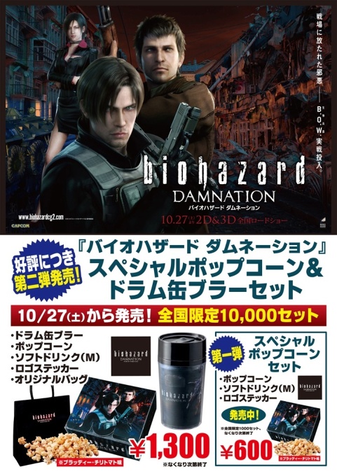 The "Resident Evil: Damnation" special popcorn and tumbler is now on sale at cinemas all over Japan! The set consists of two flavors of popcorn, brandy and chilli tomato, in a special box and a medium-sized soft drink with logo stickers in a really cool tumbler. There are only 10,000 sets available so hurry and grab one now!