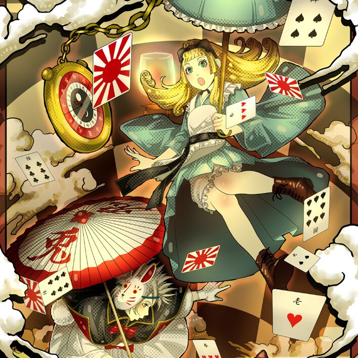 In this Japanese-style piece, Alice isn’t wearing a skirt, but rather an ando hakama, the White Rabbit is a boy wearing a rabbit mask, and the Cheshire Cat is a maneki-neko.
