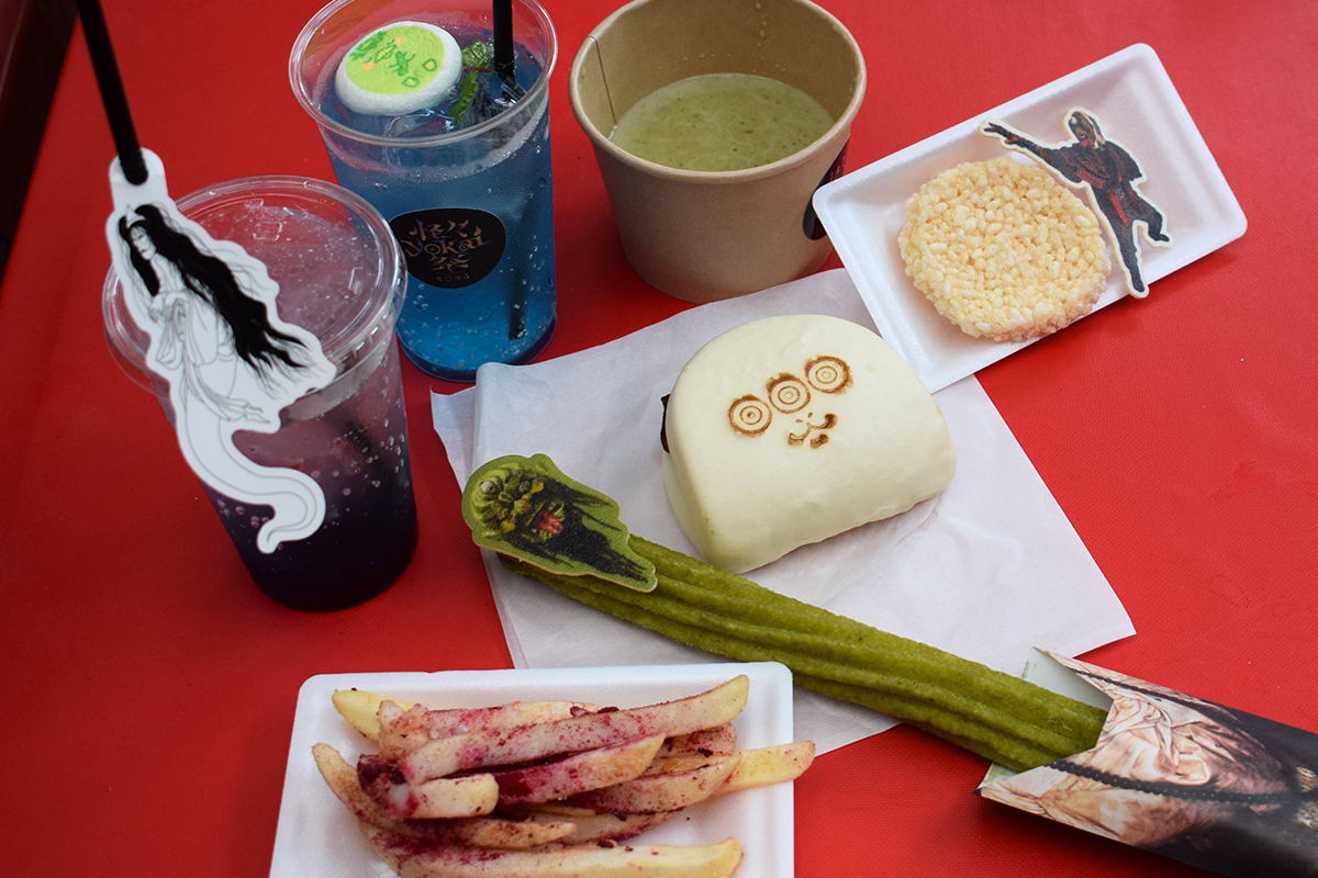 After the parade, we were free to take in the atmosphere of the park and see what other treats the festival had in store. It turns out that there were literal treats in the form of yokai-themed food and drinks that we could enjoy. Some of the highlights were a matcha churro shaped like the goblin yokai Mikoshi-nyudo with its ever extending neck and green skin as well as a pork bun with the pleasant face of Yagyo Doji looking back at you. There was also a bright blue melon soda with an adorable kappa floating merrily on top of it and much more. We were able to eat our fill and enjoy the feeling of having food that was a little out of the ordinary.