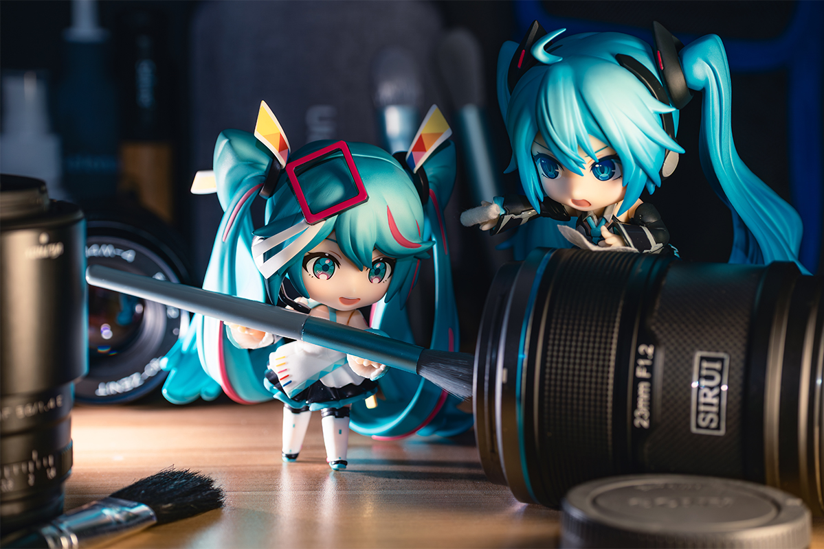 I want to capture the feeling that this is taken at night time, the owner is asleep, and the two Mikus go about secretly helping the owner clean the lenses. They are racing against time and have to finish before morning comes. The Miku on the lens has a more serious-looking face, hoping to finish cleaning the lens on time, while the Miku holding the brush is just happy-go-lucky. She is just happy being helpful to her owner.