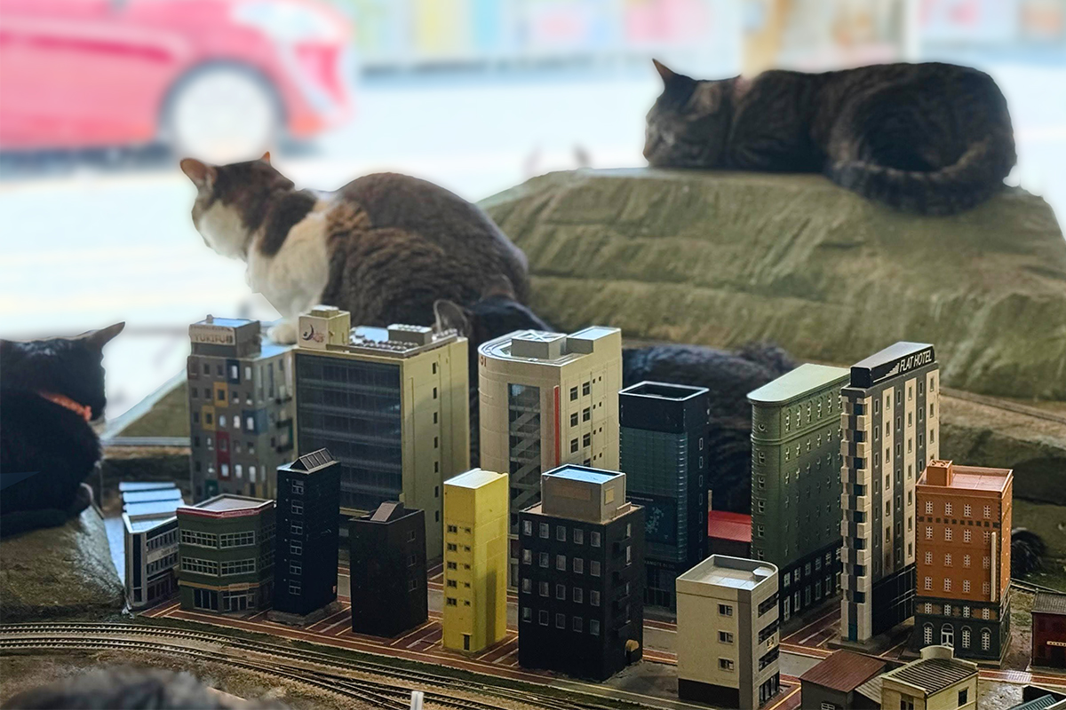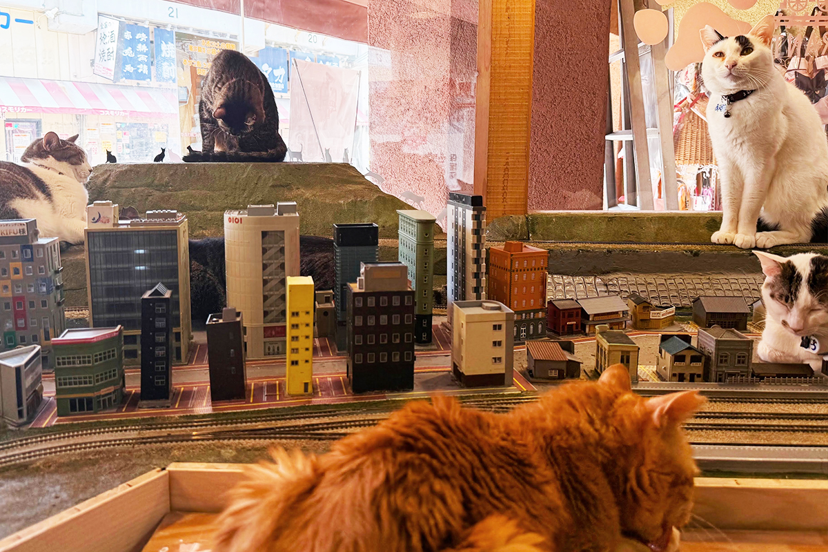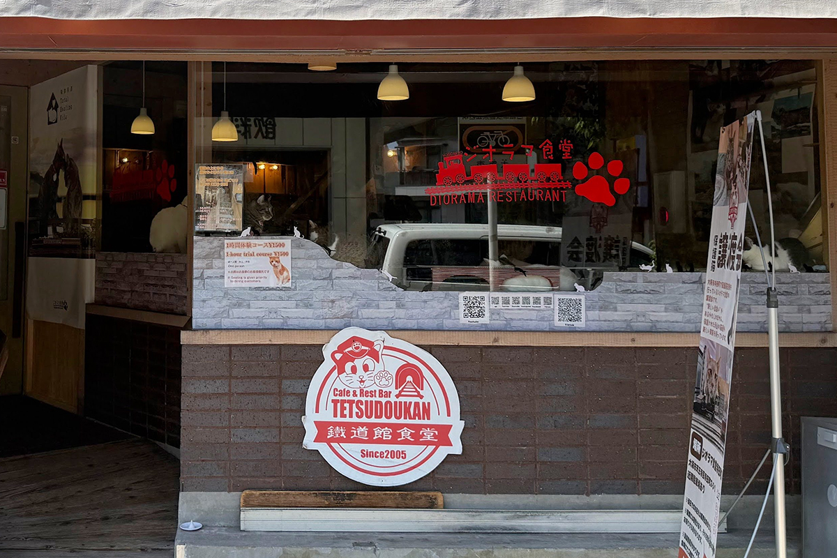 If you walk by the Diorama Restaurant in Teradacho, Osaka, you’re likely to catch sight of several cats lounging in the sunny spots by the window facing the street. Upon a closer look, you will notice that there are many more cats that initially meet the eye. Despite this being a potentially chaotic situation, if you venture inside, you enter a space where the cats are relaxed and more than happy to greet you. Here the staff are committed to creating an environment that is comfortable and safe for the many many rescue cats in their care. At the same time, their whimsical diorama setup and offerings of food and drink also make it fun and relaxing for the customers.