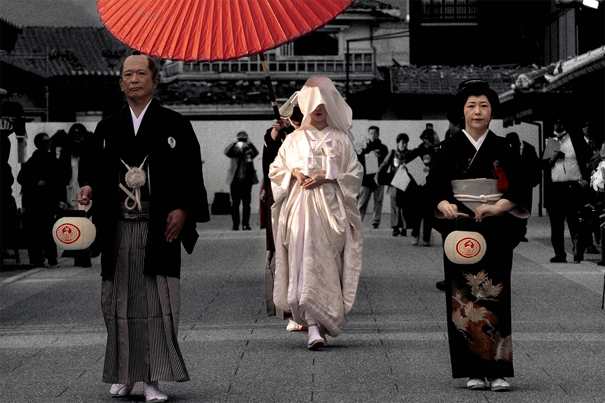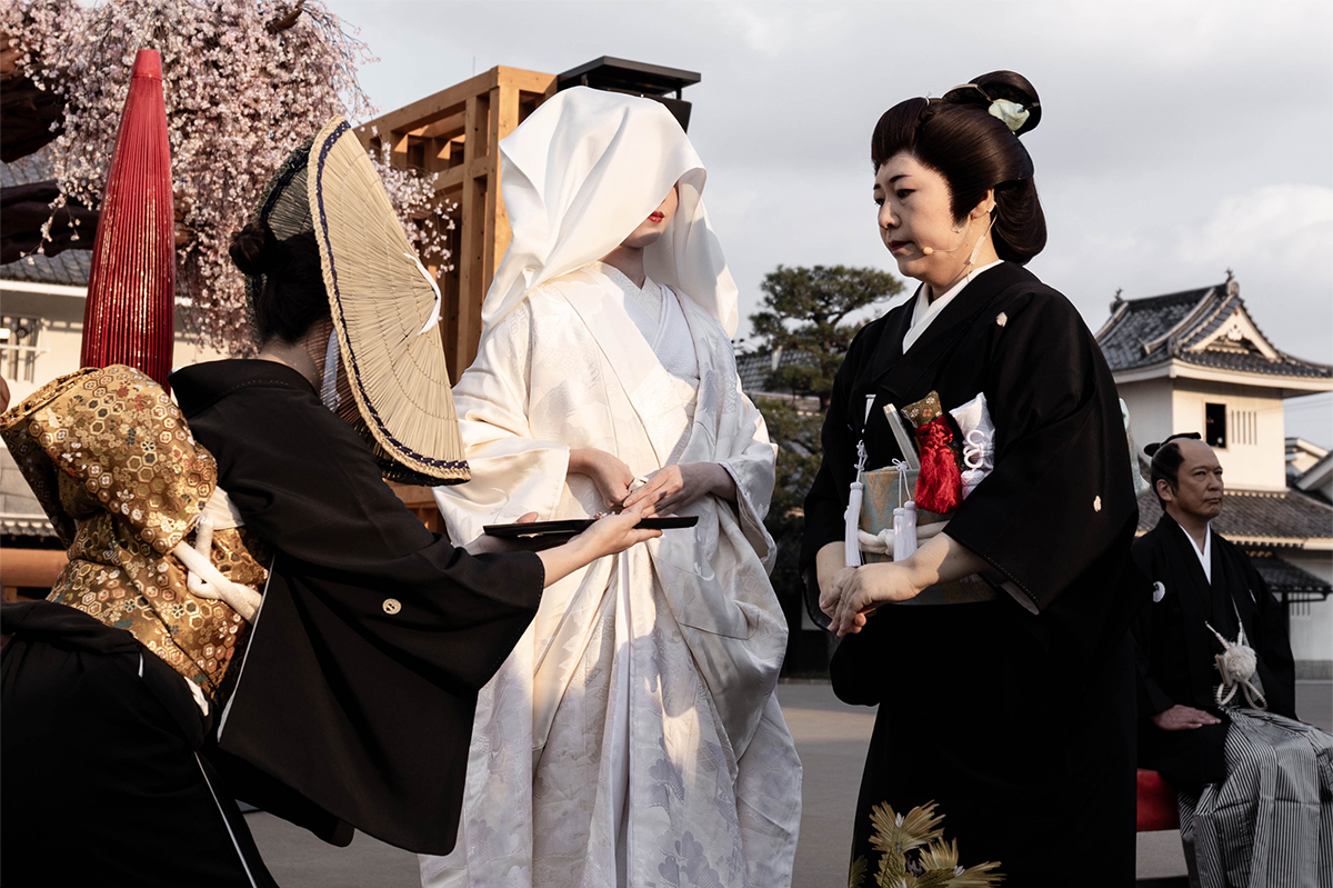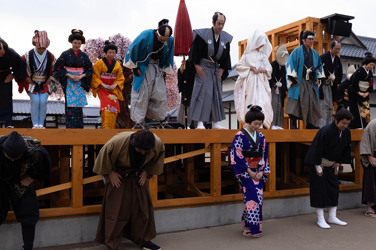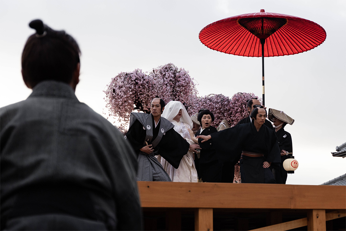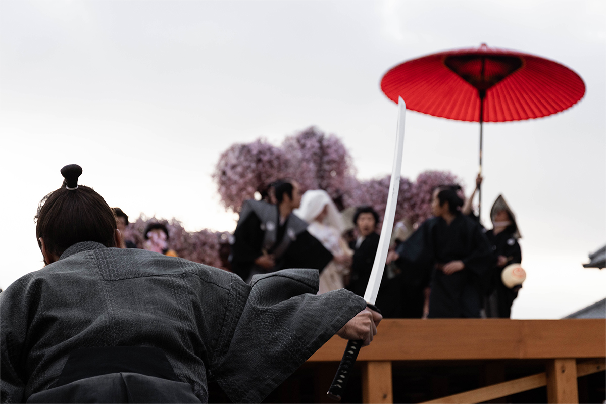 The procession made a full circuit of the town and returned to the cherry blossom tree where the bride met the groom on a stage. Before the ceremony could continue however, the proceedings were suddenly interrupted by the presence of a villain and his minions out for blood. The crowd looked on in rapt attention as the lives of the bridal party were suddenly placed in peril.