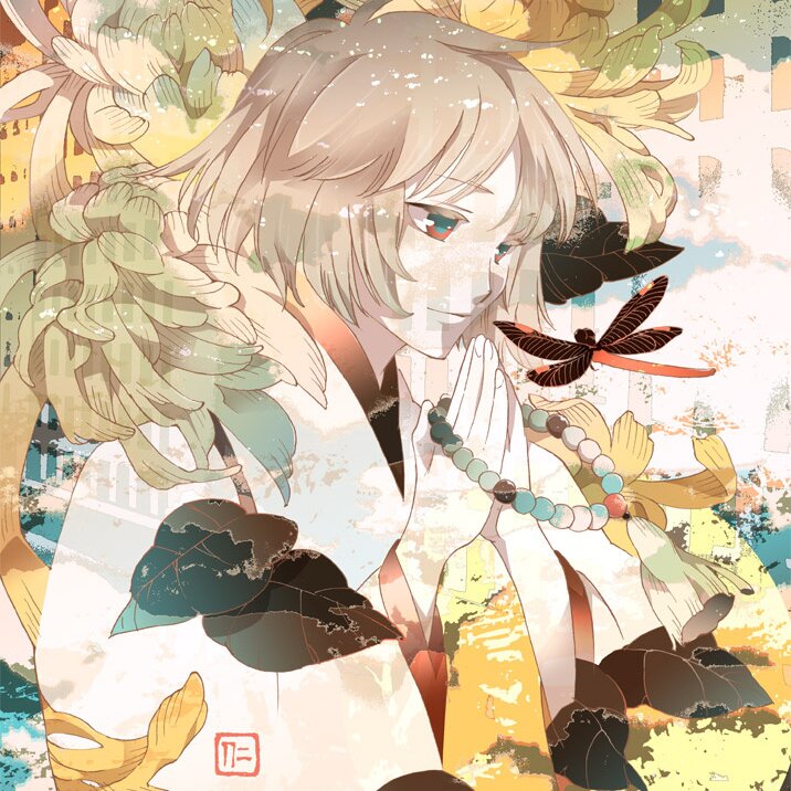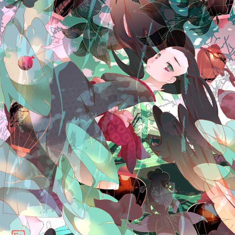 1. I go through the line drawing with ink, then import it with a scanner. I use Photoshop.2. I decide on the overall image and colors in broad terms. For background material and texture I process a photo I took myself.3. I divide the colors for each part and add the shadows in multiple layers.4. I adjust the expressions in their eyes and the fine gradation by adding colors.5. Done. As for the stamp signature, I made it myself from a piece of rubber. I import it with a scanner.About Drawing